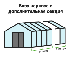 Длина базовой теплицы - 4 м., в комплекте: дверь-купе и две форточки в крыше.